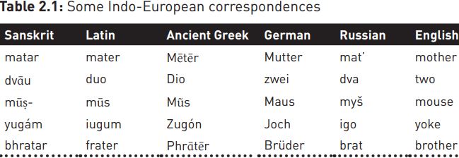 What finally helped break the hold of classical Latin in Europe was the discovery, in the late eighteenth century, of the Sanskrit scholarship of India, and notably P¯aṇini’s grammar of Sanskrit, believed to date from the fourth century BCE, which described the language of ancient sacred texts dating from some eight centuries earlier. Thanks to such codification, Sanskrit had remained, like Latin in Europe, a high-status lingua franca in India long after it had died out as a mother tongue. Bloomfield (1933: 11) describes P¯aṇini’s grammar as the first example to Europeans of ‘a complete and accurate description of a language, based not upon theory but upon observation’, i.e. one unfettered by classical Latin or Greek models. It also brought to light some striking resemblances between Sanskrit and the more familiar language families of Europe, i.e. the Romance languages, the Germanic group (e.g. German, Danish, English, Dutch) and the Slavonic (e.g. Russian, Czech, Polish, Bulgarian). As the table below demonstrates, these similarities were far too common and regular to be the result of mere chance.