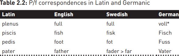 The best-known example of such correspondences is Grimm’s Law, named after Jakob Grimm, but drawing on the observations of Schlegel, Kanne and Rask, which explains a number of correspondences between Latin, Sanskrit and Germanic in terms of sound changes from Indo-European. In many words where Latin has [p], the Germanic languages have [f], as in the examples below.