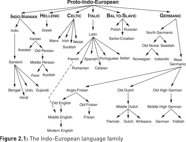 From these regular patterns of sound change, August Schleicher developed the family tree model (which owed much to botanical classification methods developed by Linnaeus), tracing the ‘parentage’ of living languages back to PIE. One version of the Indo-European family tree can be seen in the following diagram: