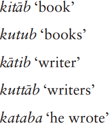 Though this fact is somewhat disguised by the orthography in the case of louse/lice and mouse/mice, all these examples involve monosyllabic items in which a vowel change occurs in the nucleus position in the plural, but the onset and coda are left unchanged. One might therefore wish to posit a discontinuous root morpheme in each case, i.e. /m_s/ for mouse and /f_t/ for foot. Though this might appear to be stretching a point, it is not in fact implausible: in Semitic languages, for example, a number of related words share a common root in which the vowels change, as illustrated by the root k_t_b in Arabic: