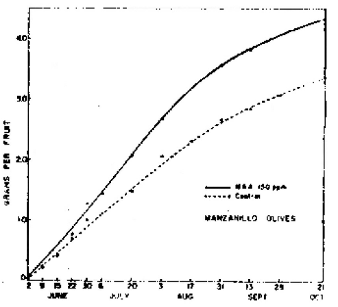 وقد وجد المزارعون من خلال ممارستهم أن رش اشجار الزيتون بمحلول نفتالين استيك أسيد NAA هو الاداة المقبولة من أجل كمية ونوعية الثمار وقد أوصت وزارة الزراعة الأمريكية مزارعي الزيتون في الولايات المتحدة باستعمال NAA كمحلول مخف للثمار إذا استعمل بتركيز 150 جزء / المليون خلال 3 - 17 يوما من مرحلة الازهار الكامل ( تفتح حوالي 80 ٪ من البراعم الزهرية ) أي خلال فترة 27 أيار - 5 حزيران. وان موعد الرش هو في غاية الاهمية. فاذا كان الرش مبكرا فانه يزيل ثمارا كثيرة، وان كان متأخراً لا يزيل الشيء المطلوب من الثمار ولا بد من استعمال NAA بالتركيز السابق مع مادة ناشرة للعمل كمادة مرطبة للأوراق أذ ( 100 جزء / المليون من NAA + ½ ٪ من زيت صيفي خفيف ) قد أعطت نتائج جيدة.