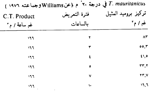 ويعبر عنه أيضاً بـ غرام ساعة / م3 وتساعد هذه المعرفة كثيراً في اعمال المكافحة. وللإيضاح نورد الجدول التالي الذي يبين التراكيز المطلوبة لبروميد المثيل × زمن التعريض مع ناتج التركيز × الزمن C.T. Product لقتل 99٪ من حشرة خنفساء الحبوب المجروشة T. mauritanicus