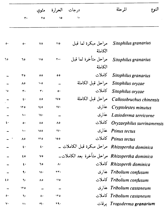 جدول يبين تقديرات نواتج التركيز في الزمن C.T.Product (ملغم/ ساعة / لتر) 99.9% من المراحل المختلفة لحشرات المخازن في درجات الحرارة المئوية 10 ، 15 ، 25، 30 ورطوبة نسبية قدرها 70 % بالتبخير بمادة بروميد المثيل (عن 1966 Munro)