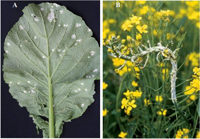 أعراض الإصابة بمرض الصدأ الأبيض على الصليبيات. (A) بثرات صغيرة بيضاء على الورقة. (B) أعراض الإصابة على ساق نبات اللفت الزيتي.