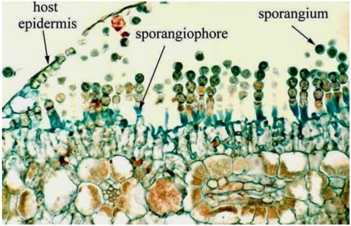 بثرة للفطر Albugo candida المسبب لمرض الصدأ الأبيض على الصليبيات، إذ يلاحظ تمزق بشرة النبات تحت ضغط الأبواغ عليها. كما يلاحظ تشكل الأبواغ في سلاسل على حوامل قصيرة صولجانية الشكل.