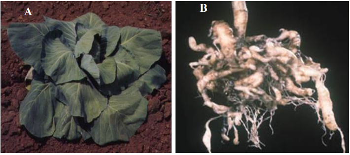 أعراض الإصابة بمرض الجذر الصـولجاني على الصليبيات المتسبب عن الفطر Plasmodiophora brassicae. A)) شحوب النبات المصاب وذبوله خلال النهار. (B) تضخم الجذور التي أخذ معظمها شكلاً مغزلياً.