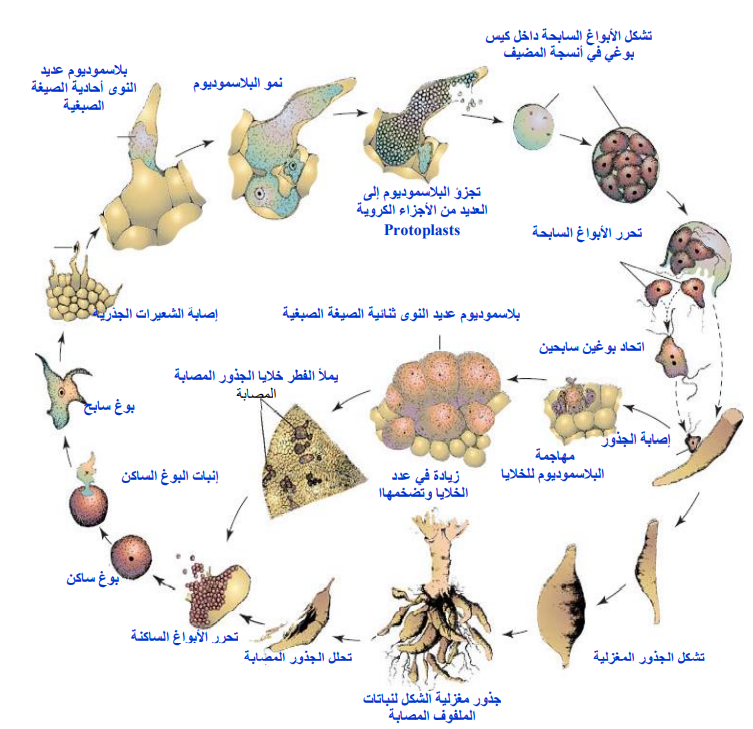 عند توفر الظروف المناسبة، تنبت الأبواغ الساكنة ليعطي كل منها بوغا سابحاً Zoospore وحيد النواة وذا سوطين إحداهما قصير والآخر طويل، وإذا توفر لهذه الأبواغ الوسط المائي فإنها تسبح لتصادف العائل المناسب، وعندئذ تخترق الشعيرات الجذرية للمجموع الجذري وتستقر داخلها، ثم تفقد السياط وتعرف حينئذ باسم الأميبا المخاطية، التي تستطيل وتنقسم نواتها عدد من الانقسامات العادية ليتشكل البلاسموديوم عديد النوى وحيدة المجموعة الصبغية، ثم يتجزأ البلاسموديوم إلى عدد من الأجزاء الكروية رقيقة الجدر تدعى Protoplasts، وتنقسم نواة كل منها عدد من الانقسامات العادية، وتحاط كل نواة بنت بجزء من الهيولي لتحرر عدداً من الأبواغ السابحة ثنائية السياط مشابهة تماماً للأبواغ التي خرجت من الأبواغ الساكنة، ثم تخرج هذه الأبواغ من العائل لتحدث إصابات جديدة على نفس النبات أو على النباتات المجاورة، وقد تسلك سلوك الأعراس، إذ تتحد في أشفاع مشكلة البيضة الملقحة Zygote، التي تدخل من جديد إلى الطبقات الداخلية من أنسجة الشعيرات الجذرية لتكون بلاسموديوم جديد عديد النوى ثنائية المجموعة الصبغية، الذي يستطيع أن ينتقل من خلية إلى أخرى داخل أنسجة النبات العائل، مما يؤدي إلى انقسام خلايا المضيف بسرعة ويزداد حجمها، وهذا ما يعبر عنه بالإفراط في حجم الخلايا (التضخم) Hypertrophy، وفي نهاية الموسم يتجزأ البلاسموديوم إلى كتلة من الأبواغ الساكنة، وذلك بعد حدوث الانقسام المنصف لنواها، وعند تحلل الجذر تتحرر الأبواغ الساكنة التي تبقى في التربة حتى الربيع التالي لتنبت مع عودة الظروف المناسبة وتعيد دورة حياة الفطر من جديد.