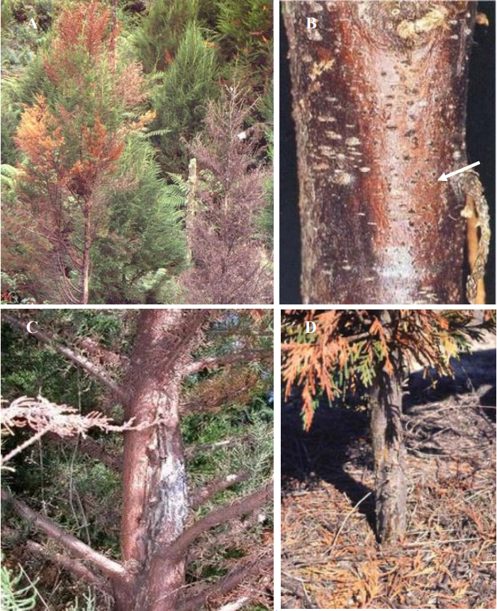 أعراض الإصابة بمرض تقرح أشجار السرو المتسبب عن الفطر Seiridium cardinale. (A) موت تراجعي على الفروع مع ملاحظة وجود مناطق متفرقة بلون بني محمر على تاج الشجرة. (B) تظهر منطقة الإصابة على الجذع في البداية على شكل بقعة بنية إلى بنفسجية اللون، وتلاحظ عليها إثمارات الفطر السوداء اللون (مشار إليها بسهم). (C) منطقة متقرحة على الساق مع ملاحظة القلف المتشقق أو المتصدع وإفرازات راتنجية. (D) تقرح على الجذع الرئيسي، وسقوط الأوراق الإبرية التي اكتسبت لوناً محمراً.