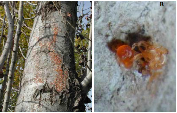 أعراض الإصابة بالتقرح السيتوسبوري على الحور المتسبب عن الفطر Cytospora A) .chrysosperma) إفرازات هلامية برتقالية اللون على القلف الميت لجذوع الأشجار المصابة. (B) إفرازات هلامية خيطية ولولبية الشكل تخرج من فوهة البكنيدات.