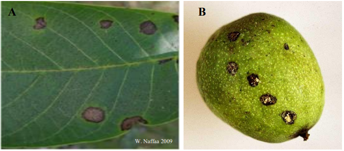 أعراض الإصابة بمرض أنثراكنوز الجوز. (A) بقع بنية داكنة، ومحاطة بهالة صفراء على الأوراق. (B) بقع بنية داكنة أو سوداء على الثمار.