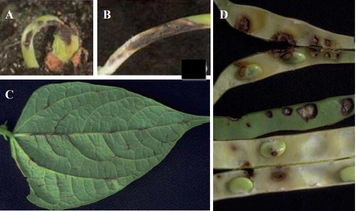 أعراض الإصابة بمرض أنثراكنوز الفاصولياء. (A) لطخ بنية داكنة وغائرة على الأوراق الفلقية والساق. (B) لطخ بنية داكنة إلى سوداء اللون تحيط بساق البادرة. (C) لطخ متطاولة بلون بني داكن على عروق الورقة. (D) أعراض الإصابة على القرون والبذور.