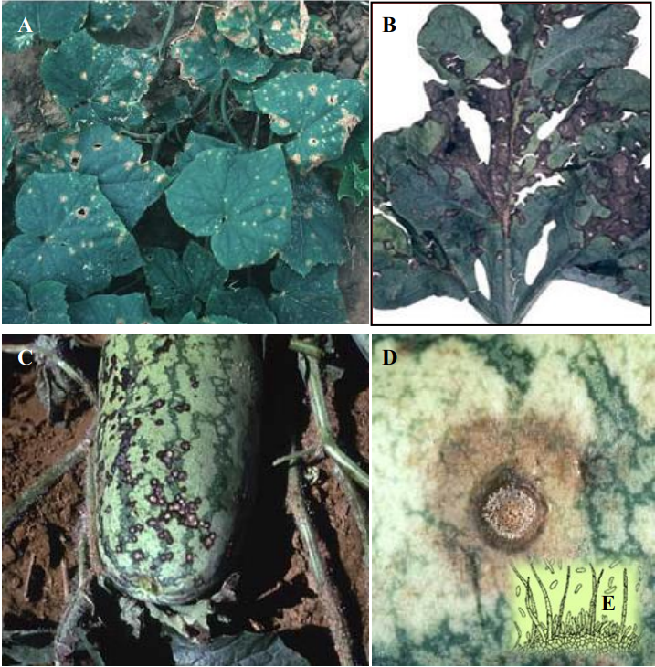 أعراض الإصابة بمرض الأنتراكنوز على القرعيات. (A) أنثراكنوز الخيار، إذ يلاحظ ظهور بقع بنية أو محمرة، وسقوط النسيج الميت في وسط البقع تاركا مكانه ثقوبة. (B) أعراض الإصابة بالأنثراكتوز على أوراق البطيخ الأحمر، إذ يلاحظ تحول اللطخ والبقع إلى اللون البني الداكن أو الأسود. (C) بقع غائرة أو تقرحات على سطح ثمار البطيخ الأحمر. (D) كتل بوغية وردية أو قرنفلية اللون في وسط البقعة، ويبين المقطع العرضي تشكل حوامل بوغية قصيرة في أسيرفيولات، تحمل عليها الأبواغ الكونيدية، كما يلاحظ وجود شعيرات طويلة منتصبة (E).