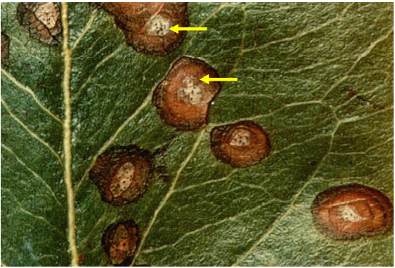 أعراض الإصابة بمرض تبقع أوراق الكمثرى، إذ تشاهد على الأوراق يقع بيضاء رمادية في الوسط وذات محيط بني داكن، كما تلاحظ البكنيدات في مركز البقع على شكل نقاط سوداء صغيرة (مشار إليها باسهم). (عن 1996 ,.Giraud et al).