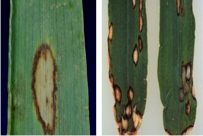 أعراض الإصابة بمرض السفعة الحقلية على الشعير المتسبب عن الفطر Rhynchosporiun secalis إذ تلاحظ على أنصال الأوراق بقع بيضوية أو مستطيلة مبيضة أو قشية اللون في المركز وذات حواف بنية داكنة.