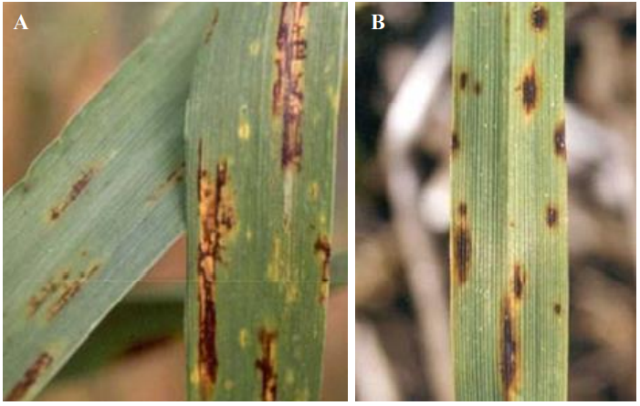 أعراض الإصابة بمرض التبقع الشبكي على الشعير المتسيب عن الفطر Pyrenophora teres. (A) الشكل الشبكي. (B) الشكل البقعي.
