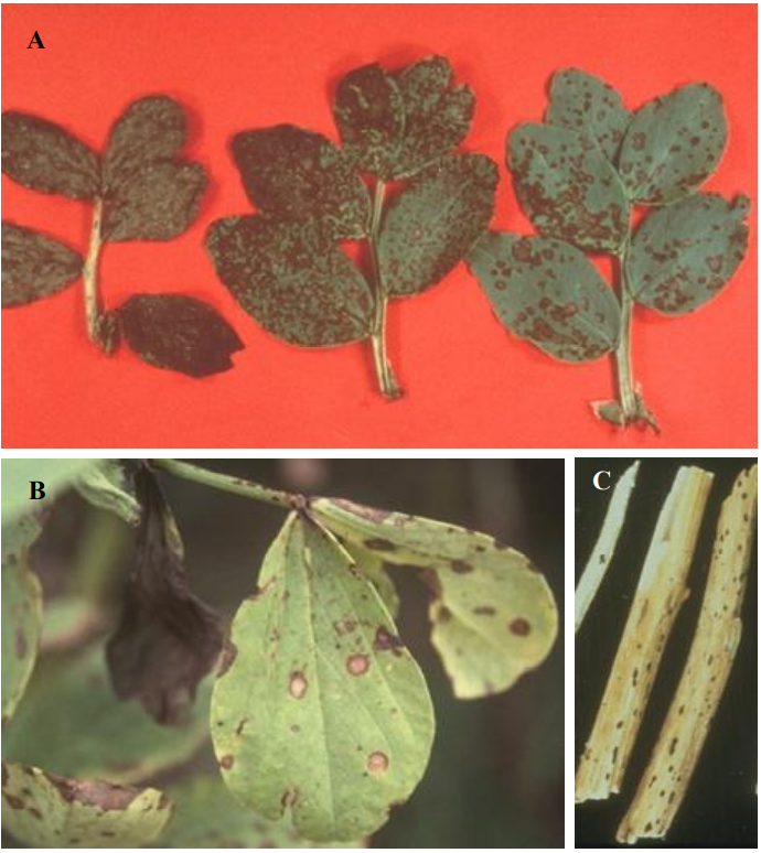 اعراض الإصابة بمرض التبقع البني او الشوكولاتي على الفول، والمتسبب عن الفطر Botrytis fabae (A) تبقعات محمرة غير منتظمة الشكل ومتحدة مع بعضها بعضا لتغطي كامل سطح الورقة. (B) بقع دائرية على الوريقات، مركزها رمادي وحوافها بنية محمرة. (C) اجسام حجرية صغيرة سوداء اللون على السوق المصابة.