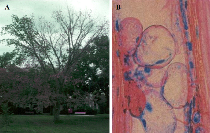 أعراض الإصابة بمرض ذبول الدردار. A: ذبول وتعري جزء من الشجرة. B: تشكل التيلوزات داخل الأوعية الخشبية لساق الشجرة المصابة.