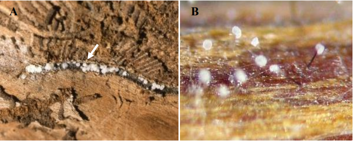 (A) الأبواغ اللاجنسية للفطر من النمط Graphium-type conidia) Graphium) داخل أنفاق حشرة سوس القلف (مشار إليها بسهم). (B) كويمات الفطر Coremia الناتجة من تجمع الحوامل الكونيدية مع بعضها بعضاً وتحمل الأبواغ في قمتها.