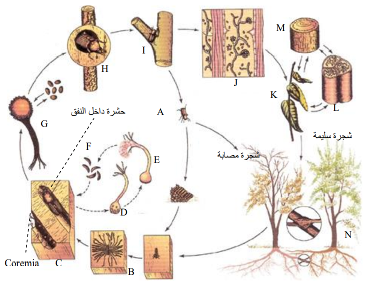 A: حشرة سوس القلف تحمل أبواغ الفطر. B: أنفاق تحفرها الأنثى البالغة واليرقة في القلف. C: نمو مشيجة الفطر في القلف وفي الأنفاق. D: ثمرة زقية دورقيه .Perithecium E: تحرر الأبواغ الزقية من الثمرة الزقية. F: أبواغ زقية. G: أبواغ كونيدية من النمط H .Graphium: خروج الحشرة البالغة حاملة أبواغ الفطر. I: تنقل الحشرة الأبواغ إلى شجرة سليمة. J: مشيجة وأبواغ الفطر من النمط Sporothrix (أو Cephalosporium-type) في الأوعية الخشبية. K: ذبول الأوراق فوق نقطة حدوث العدوى. L: مشيجة وأبواغ الفطر في الأوعية الناقلة. M: تلون الأوعية الخشبية على شكل حلقة بنية في الساق المصاب. N: انتقال الإصابة من شجرة مصابة إلى أخرى سليمة عن طريق التحام الجذور. (عن 2004 ,Agrios).