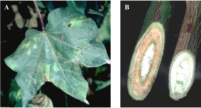 أعراض الإصابة بالذبول الفرتيسليومي على القطن المتسبب عن الفطر Verticillium dahlia. A: بقع شاحبة على حافة الورقة وبين العروق. B: مقطع عرضي يبين تلون الأوعية الناقلة في ساق نبات مصاب بالذبول مقارنة مع لون الأوعية الناقلة في ساق نبات سليم.