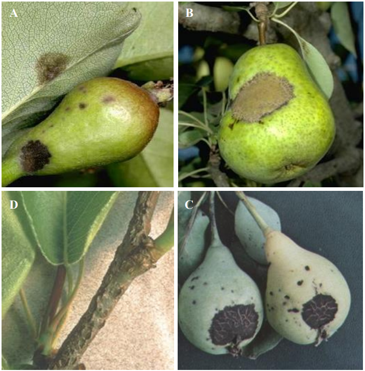 أعراض الإصابة بجرب الكمثري المتسبب عن الفطر A .Venturia pirina: بقعة دخانية اللون على الأوراق، وبقع داكنة اللون على الثمار. B: تشكل النسيج الفليني الذي يغطي منطقة الإصابة كرد فعل من قبل العائل. C: ظهور تشققات في منطقة الإصابة، كما يلاحظ بقع جربيه صغيرة ناتجة عن حدوث إصابات متأخرة. D: بثرات متقرحة بيضوية اللون على الفروع المصابة. (A و B عن Jack Kelly Clark).