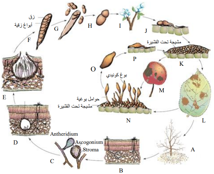 A: أوراق مصابة متساقطة على الأرض. B: مشيجة بين خلوية في الأوراق. C: إخصاب بين العضو المذكر Antheridium والعضو المؤنث D .Ascogonium: بدء تشكل الثمرة الزقية الكاذبة E .Pseudothecium: ثمرة زقية ناضجة بداخلها الزقاق والأبواغ الزقية. F: زق وبداخله الأبواغ الزقية. G: تحرر الأبواغ الزقية. H: بوغ زقي. I: شجرة تفاح في طور الإزهار. J: إنبات البوغ الزقي واختراق القشيرة. K: حدوث العدوى. L: بقع جرب على الأوراق. M: بقع جرب على الثمار. N: تشكل الأبواغ الكونيدية. O: بوغ كونيدي. P: إنبات البوغ الكونيدي وحدوث العدوى.