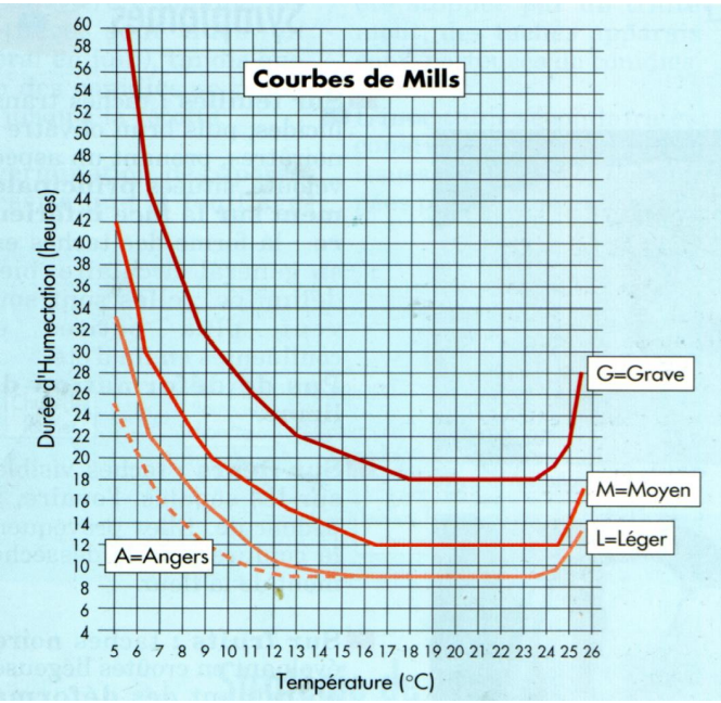 شكل يبين منحني Mills المستخدم للتنبؤ يدويا بالفترات الحرجة لحدوث الإصابة بجرب التفاح.