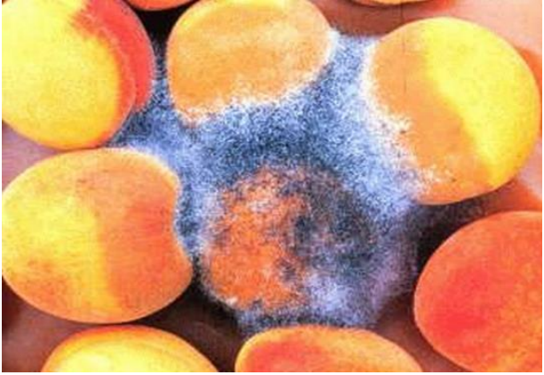 أعراض الإصابة بالعفن الطري على الدراق. إذ تلاحظ نموات الفطر السوداء الرمادية نتيجة تشكل الأكياس البوغية السبورانجية.