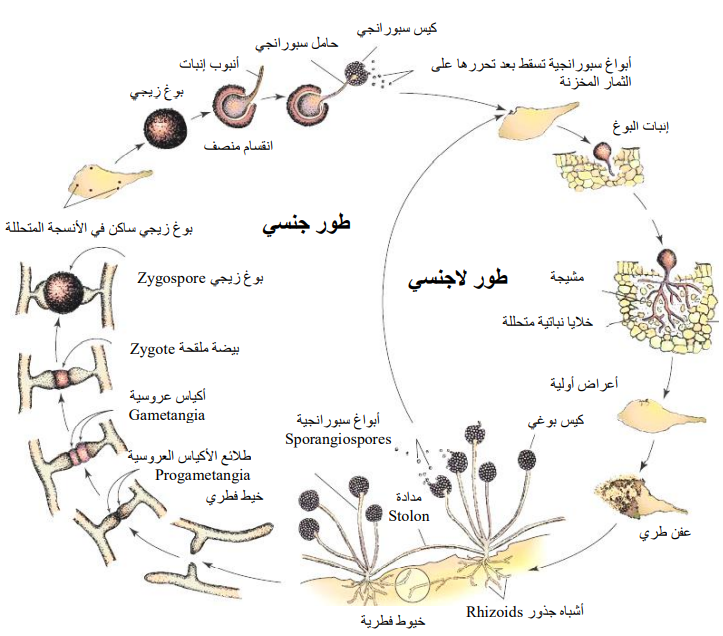 يستمر الفطر بالنمو داخل الأنسجة المتحللة، وعندما تضعف البشرة وتتحلل تخرج مشيجة الفطر، وتظهر عليها حوامل بوغية طويلة Sporangiophores، تحمل في قمتها أكياسا بوغية سبورانجية Sporangia كروية وسوداء اللون، ويحتوي كل منها على آلاف الأبواغ السبورانجية Sporangiospores. وعندما تنمو مشيجة الفطر على سطح الأجزاء المصابة، تشكل ما يدعى بالمدادات Stolons، وهي عبارة عن خيوط فطرية هوائية تعطي عند ملامستها للوسط من جديد أشباه جذور Rhizoids، تستطيع أن تخترق البشرة الطرية، وتتغلغل داخل النسيج النباتي، وتخرج منها حوامل بوغية هوائية تحمل الأكياس البوغية. ومن كل نقطة تلامس مع الوسط يتشكل المزيد من المدادات التي تنتشر في كافة الاتجاهات. وعندما يبدأ المصدر الغذائي بالنفاذ في الأنسجة المصابة، ومع وجود السلالات الفطرية المتوافقة جنسيا، يبدأ تشكل الأبواغ الزيجية، فعندما يتسنى لخيطين فطريين من سلالاتين متوافقتين الاقتراب من بعضهما، يخرج من كل منهما بروز، ليتشكل بذلك طلائع الأكياس العروسية Progametangia، وبعد تلامسهما تنفصل قمة كل منهما بجدار عرضي لتتشكل بذلك الأكياس العروسية Gametangia، ثم يحدث الاندماج الهيولي المتبوع باندماج نووي لتتشكل البيضة الملقحة Zygote، التي تتطور إلى بوغ زيجي Zygospore ذي جدار أسود وثخين، وهو يمثل طور السكون عند هذه الفطريات. وعند إنباته يعطي حاملا بوغيا يحمل في قمته كيسا بوغية مليئة بالأبواغ السبورانجية.