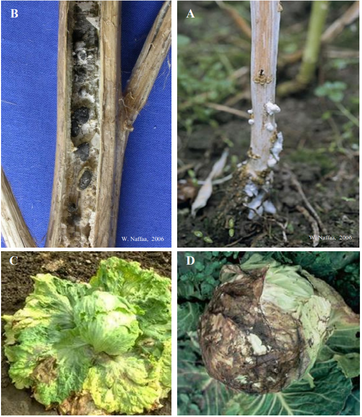 شكل يبين: أعراض الإصابة بأعفان السكليروتينيا. (A) مشيجة قطنية بيضاء على قاعدة ساق نبات لفت زيتي مصاب بالمرض. (B) أجسام حجرية سوداء داخل ساق نبات لفت زيتي. (C) أعراض الإصابة على الخس ويلاحظ سقوط الأوراق الخارجية المصابة. (D) عفن الملفوف.