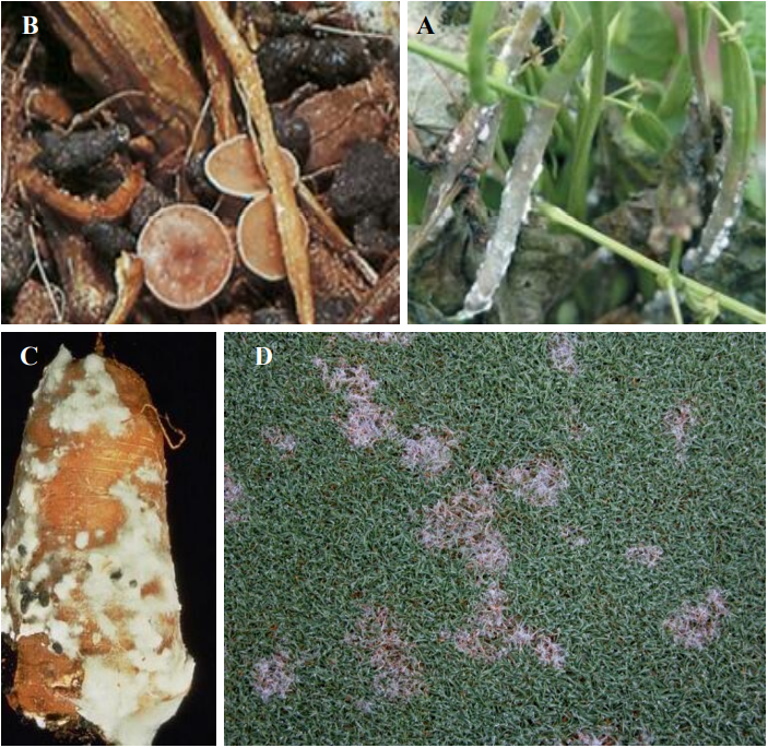 شكل يبين: أعراض الإصابة بأمراض السكليروتينيا. (A) مشيجة قطنية بيضاء على قرون الفاصولياء. (B) أجسام حجرية سوداء اللون، وقد أنبت البعض منها إلى ثمار رقية قرصية. (C) عفن أبيض على الجزر وجود بعض الأجسام الحجرية سوداء اللون. (D) أعراض الإصابة بمرض بقعة الدولار على نباتات المروج.
