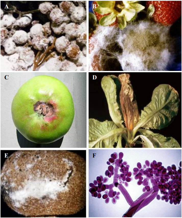 شكل يبين: أعراض الإصابة بالفطر A .Botrytis cinerea: عفن رمادي على عناقيد العنب. B: عفن رمادي على ثمار الفريز. C: عفن الطرف الزهري على ثمار التفاح. D: عفن رمادي على الخس. E: عفن رمادي على ثمار الكيوي. F: حوامل وأبواغ كونيدية للفطر .Botrytis sp إذ يلاحظ أن الخلية القمية في تفرعات الحامل البوغي مستديرة وتحمل مجموعات من الأبواغ الكونيدية على شكل عناقيد العنب.