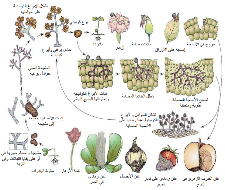 شكل يبين: دورة أمراض العفن الرمادي المتسببة عن الفطر Botrytis cinerea (عن Agrios ،2004)