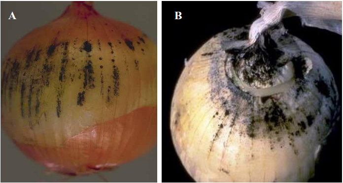 أعراض الإصابة بمرض العفن الأسود على البصل. (A) كتل بوغية سوداء اللون على شكل خطوط طولية على سطح الحراشف الخارجية للبصل الأحمر، (B) كتل بوغية حول عنق البصلة، وعلى سطحها الخارجي.