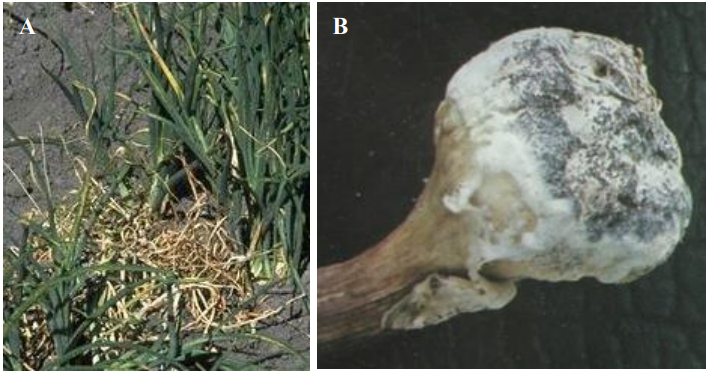 الشكل يبين: أعراض الإصابة بمرض العفن الأبيض على الثوم والبصل. (A): ذيول وجفاف نباتات البصل نتيجة الإصابة بالمرض. (B): مشيجة الفطر القطنية والبيضاء اللون على قاعدة البصلة في الثوم، كما تلاحظ عليها الأجسام الحجرية سوداء اللون عن العظمة).