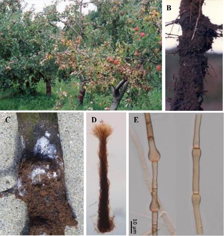 شكل يبين: A: شجرة مصابة تبدي ضعف عام في النمو، وشحوب واصفرار الأوراق، وتساقط بعضها بشكل مبكر. B: مشيجة بيضاء على جذور الأشجار المصابة (السهم) (عن C .(Rosa M. V. Sanhueza: مشيجة بيضاء على قاعدة شجرة تفاح مصابة (عن D .(C. Horlock: ضفيرة كونيدية Synema (عن J. R. Liberato). E: انتفاخات كمثريه الشكل على الخيوط الفطرية بجوار الحواجز العرضية (عن J. R. Liberato).