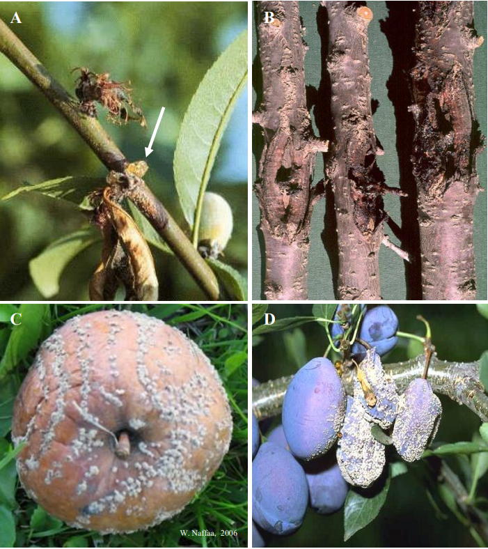 الشكل 1: أعراض الإصابة بالعفن البني. A: لفحة الأزهار على اللوزيات، وانتقال الإصابة إلى الفرع الحامل لها، مع ملاحظة وجود إفرازات صمغية على منطقة الإصابة (السهم). B: تقرح الأفرع حول الدابرة الثمرية (عن العظمة). C: الوسائد البوغية Sporodochia للفطر M. fuctigena متوضعة في حلقات دائرية على ثمرة التفاح. D: وسائد بوغية للفطر M. laxa على ثمار البرقوق.