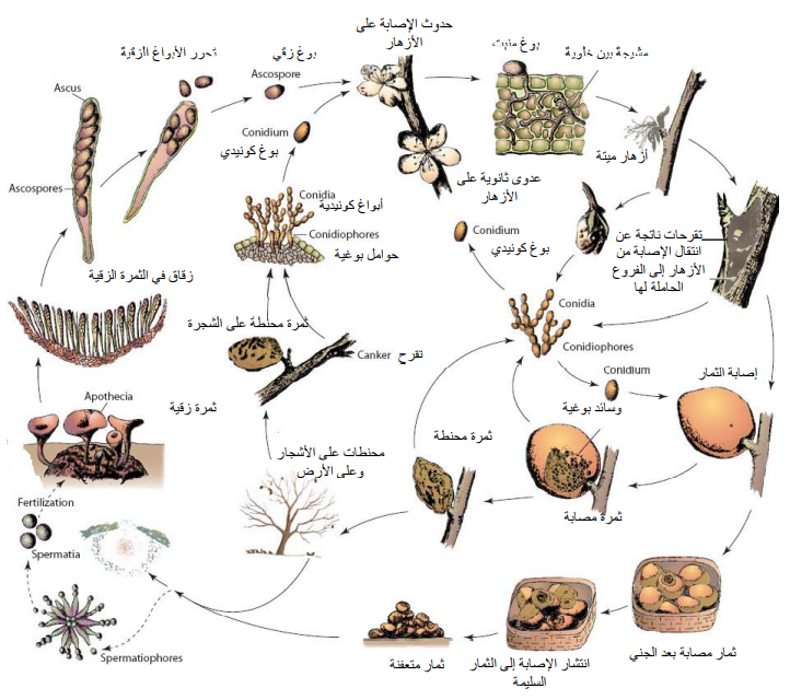 الشكل 2: دورة مرض العفن البني على اللوزيات (عن 2004 ,Agrios)