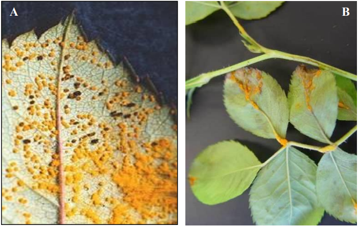 شكل يبين: أعراض الإصابة بصدأ الورد. A: بثرات يوريدية برتقالية اللون، إضافة لبعض البثرات التيليتية بلون بني داكن أو سوداء على السطح السفلي لورقة الورد. B: البثرات اليوريدية على السطح السفلي للأوراق وعلى أعناقها.
