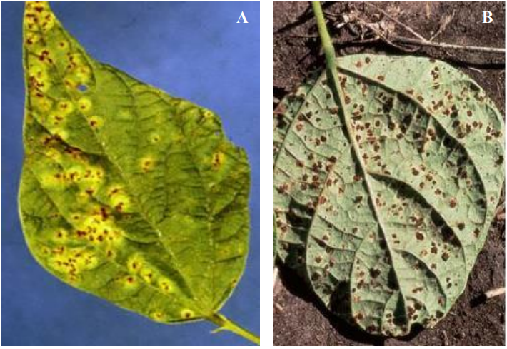 شكل يبين: أعراض الإصابة بصدأ الفول. A: البثرات اليوريدية على السطح العلوي لوريقات الفول. B: بثرات تيليتية بيضاوية الشكل على الساق. C: بثرات يوريدية على قرون الفول.