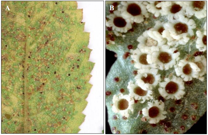 شكل يبين: أعراض الإصابة بمرض صدأ اللوزيات. (A) بثرات يوريدية بنية اللون والقليل من البثرات التيليتية السوداء على السطح السفلي لورقة شجرة البرقوق. (B) أوعية أسيدية على السطح السفلي لأوراق المضيف المناوب (شقائق النعمان).