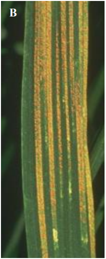 الصدأ الأصفر: الأبواغ اليوريدية صفراء اللون ومرتبة في صفوف طولية دون أن تتحد مع بعضها بعض.