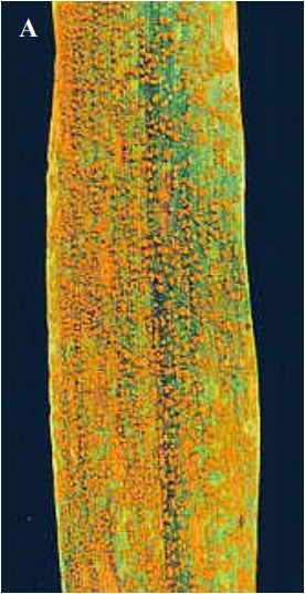 الصدأ البني أو صدأ الورقة: الأبواغ اليوريدية برتقالية اللون ومبعثرة بدون انتظام على سطح الورقة.