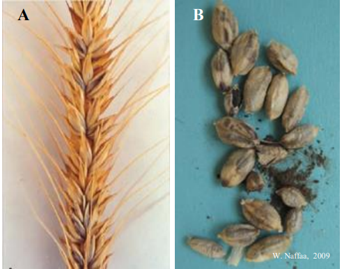 شكل 1: (A) اعراض التفحم المغطى على القمح اذ ان السنابل تبدو سليمة ظاهريا. (B) حبوب قمح متفحمة تبدو بنية اللون ومليئة بالابواغ التيلية.