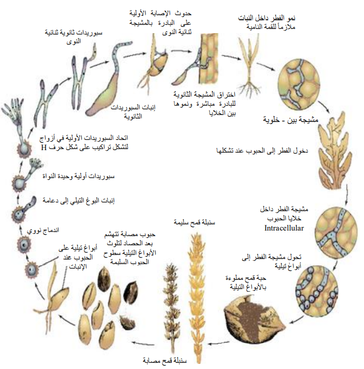 يحدث اتصال بين أزواج متوافقة من السبوريدات الأولية (من إشارتين مختلفتين + و -) وهي مازالت محمولة على الدعامات لتتشكل تراكيب على شكل حرف H دون أن يحدث اندماج نووي لتبدأ المرحلة ثنائية النوى. تنشأ من هذه البنيات سبوريدات ثانوية Secondary sporidia تنبت لتعطي مشيجه مضاعفة النوى، وهي فقط القادرة على إحداث الإصابة على البادرات قبل ظهورها فوق سطح التربة. وتصبح البادرة مقاومة للمرض عندما يبلغ عمرها 10 أيام. تنمو مشيجة الفطر جهازية في أنسجة النبات ملازمة القمة النامية، ويهاجم الفطر السنبلة عند تكوينها، ويتغذى على حساب محتويات الحبة الغذائية، ولا يبقى منها إلا أغلفتها، إذ إن الفطر لا يهاجم أغلفة الحبة والعصافات والسفا. يزداد نمو المشيجة وتتفرع خيوطها لتملأ الحبة، ثم تتحول جميع خلاياها في نهاية الموسم إلى أبواغ تيلية بلون أسود غامق أو مائل للبني (الشكل 2). وليس من السهل لغير المختصين تمييز السنابل السليمة من المصابة إلا بعد درسها باليد.