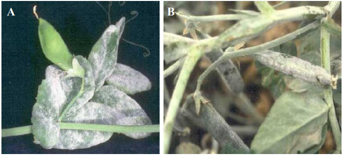 شكل يبين: أعراض الإصابة بالبياض الدقيقي على البازلاء. (A) طبقة حقيقية بيضاء تغطي الأوراق. (B) قرون مغطاة بشكل كامل بنموات الفطر الرمادية أو المائلة إلى الزرقة.