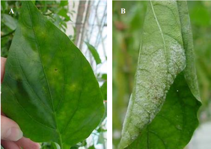 الشكل 1: أعراض الإصابة بمرض البياض الدقيقي على الفليفلة المتسبب عن الفطر Leveillula tattrica. A).) بقع صفراء على السطح العلوي للورقة. (B) نموات بيضاء دقيقية المظهر على السطح السفلي.