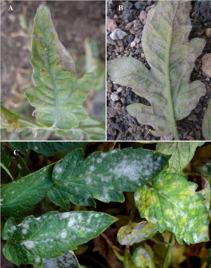 الشكل 2: اعراض الإصابة بالبياض الدقيقي على البندورة المتسبب عن الفطر Leveillula taurica: (A) بقع صفراء على السطح العلوي للورقة. (B) نموات بيضاء دقيقية على السطح السفلي. C)) اعراض الإصابة بالبياض الدقيقي المتسبب عن الفطر Oidium neolycopersici اذ تلاحظ نموات الفطر دقيقية المظهر على السطح العلوي للورقة.