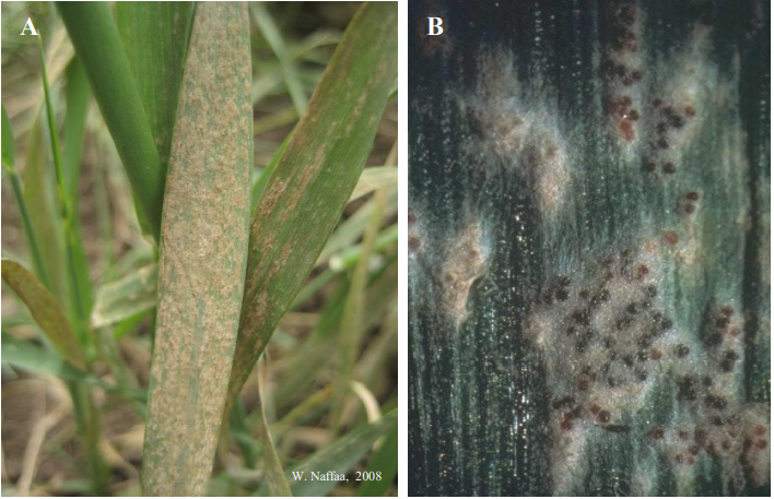 شكل يوضخ: أعراض الإصابة بالبياض الحقيقي على النجيليات. (A) الأوراق مغطاة بطبقة رمادية اللون من نموات الفطر. (B) ثمار زقية مستدير وداكنة اللون متشكلة على مشيجة الفطر.