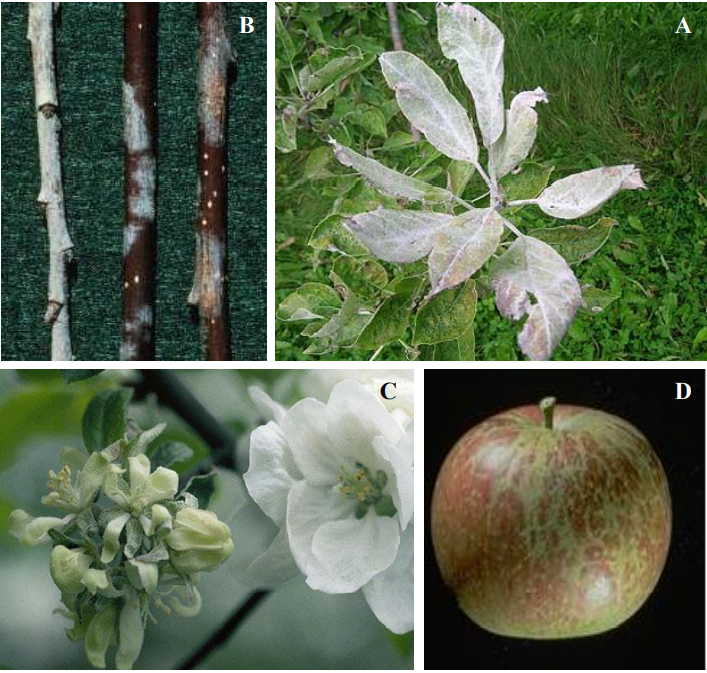 شكل يوضح: أعراض الإصابة بمرض البياض الدقيقي على التفاح. (A) نموات حديثة مغطاة بنموات الفطر البيضاء الدقيقية المظهر. (B) أعراض الإصابة على الطرود الحديثة. (C) أعراض الإصابة على الأزهار. (D) قشب على سطح الثمار نتيجة الإصابة.